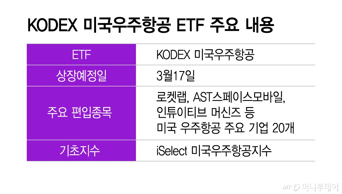 국내 ETF(상장지수펀드) 시장에서도 우주항공 기업에 투자하는 상품들이 주목받고 있는 가운데 미국 우주항공 기업에 집중 투자하는 ETF가 출시된다. 특히 주식시장 안팎에서 주목받고 있는 스페이스X 상장을 염두에 둔 상품이어서 투자자들의 관심을 끌 전망이다.
