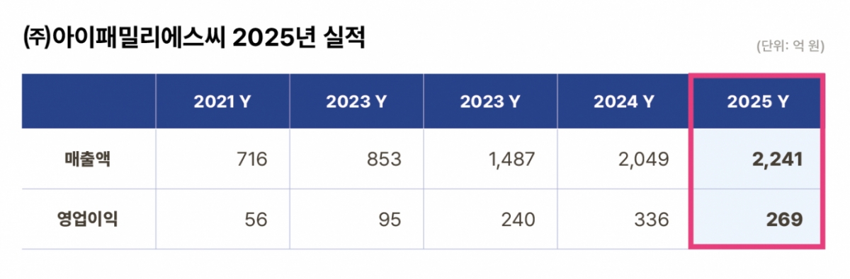 아이패밀리에스씨는 2025년 연결기준 매출액 2240억9600만원으로 전년대비 9.37% 증가하며, 사상 최대치를 경신했다. 영업이익은 268억5100만원으로 같은기간 20.2% 줄었다.