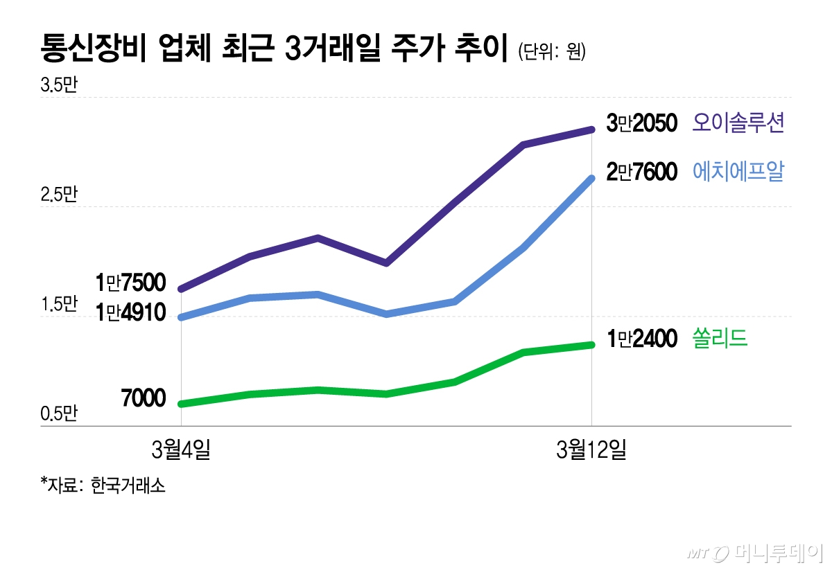 중계기 위주의 무선 통신장비 업체 쏠리드(12,400원 ▲690 +5.89%)는 690원(5.89%) 오른 1만2400원을, 광 트랜시버(송수신기) 제조사인 오이솔루션(32,050원 ▲1,400 +4.57%)은 1400원(4.57%) 오른 3만2050원을 기록했다. 두 업체는 장중 각각 1만3410원, 3만6500원까지 오르며 52주 신고가를 경신했다.