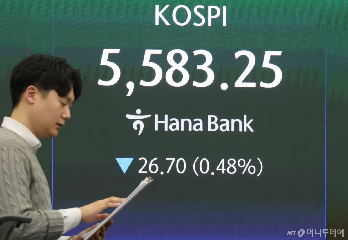 ![[서울=뉴시스] 홍효식 기자 = 코스피가 전 거래일(5609.95)보다 26.70포인트(0.48%) 하락한 5583.25에 마감한 12일 오후 서울 중구 하나은행 딜링룸 전광판에 지수가 표시되고 있다. 코스닥 지수는 전 거래일(1136.83)보다 11.57포인트(1.02%) 오른 1148.40에 마쳤다. 서울 외환시장에서 원·달러 환율은 전 거래일(1466.5원)보다 14.7원 오른 1481.2원에 주간 거래를 마감했다. 2026.03.12. yesphoto@newsis.com /사진=홍효식](https://thumb.mt.co.kr/cdn-cgi/image/f=avif/21/2026/03/2026031216072999468_1.jpg)