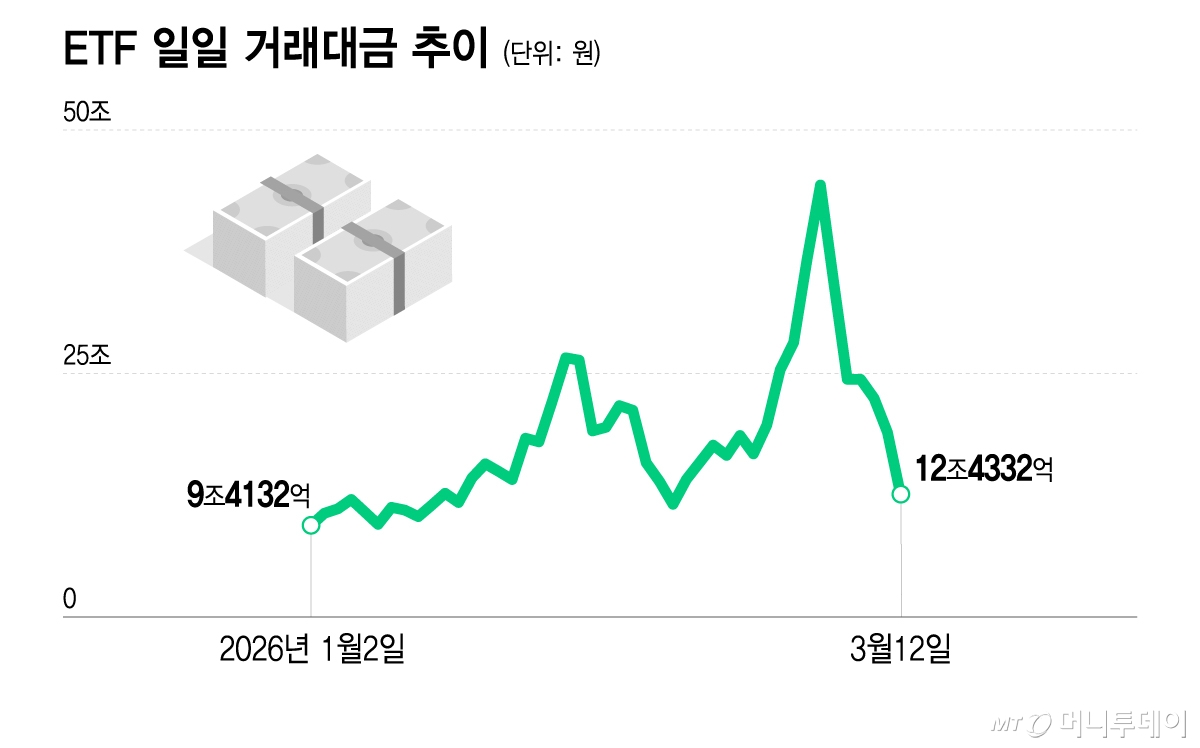 12일 한국거래소에 따르면 3월 일평균 ETF 거래대금은 27조2501억원으로 2월(18조4848억원)보다 1.47배, 1월(14조4099억원)보다 1.89배 많다. 특히 지난 4일엔 44조3606억원으로 올들어 처음 40조원대를 기록했는데 이날은 2001년 9·11테러 당시를 넘어 코스피지수가 역대 최대 하락폭을 기록한 날이다.