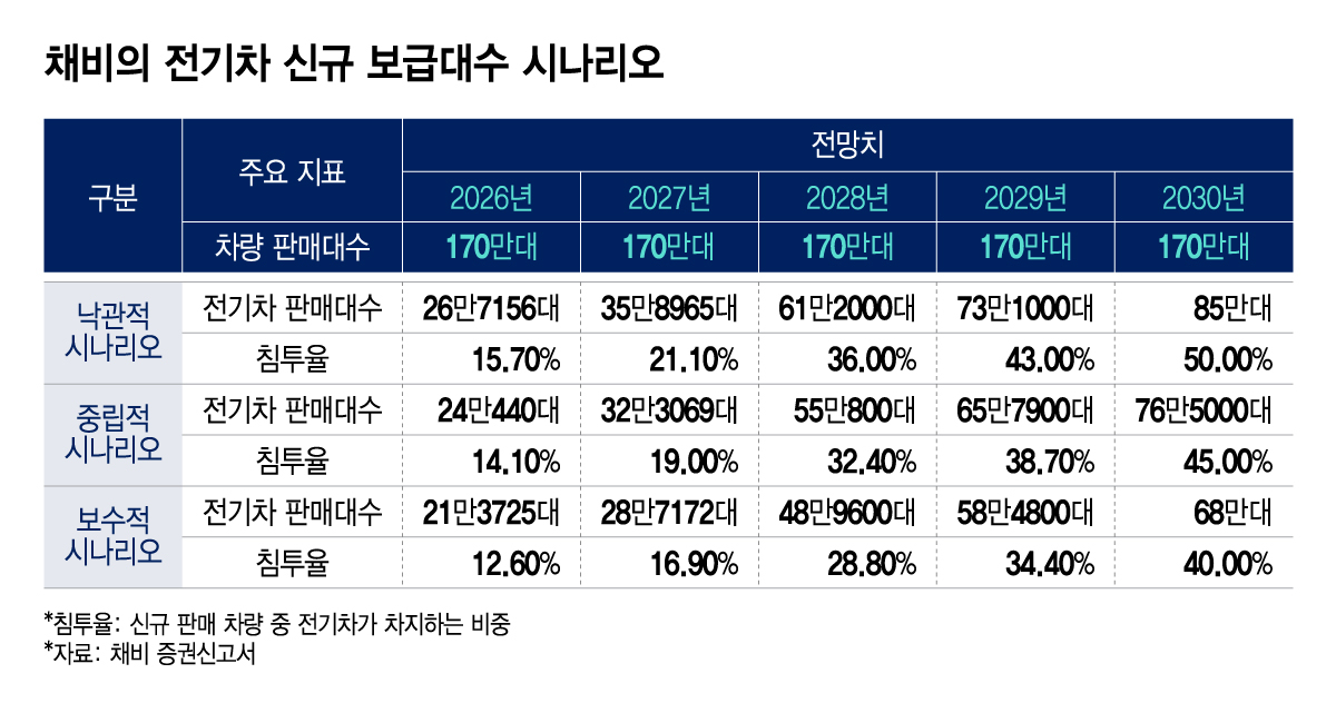 2028년 추정 EBITDA 755억원은 대기환경보전법상 전기차 보급목표의 90%가 달성되는 상황을 가정해 채비가 마련한 '중립 시나리오'에서 나온 숫자다. 전기차 신규 판매가 2025년 21만대에서 2028년 55만대로 연평균 37%씩 늘어야 나올 수 있는 숫자다. 10%포인트만 낮아져도 EBITDA는 371억원으로 반토막 나는 구조다.