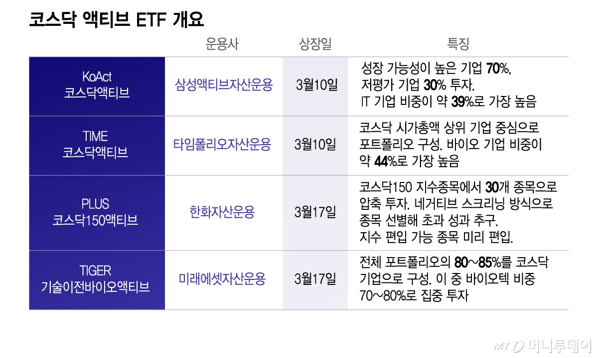 코스닥을 기초로 한 액티브 ETF(상장지수펀드) 출시가 잇따른다. 정부의 코스닥 활성화 정책과 맞물려 관련 상품이 빠르게 늘어나는 추세다. 종목 간 성과 격차가 큰 코스닥 시장 특성상 종목 선별 전략을 잘 활용한 액티브 ETF가 새로운 수급 동력으로 자리 잡을 것이라는 관측도 나온다.