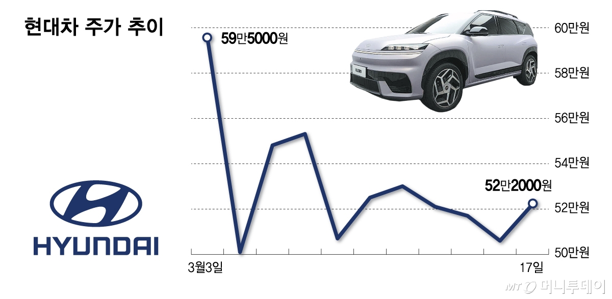 하지만 최근까지 현대차그룹주 등 자동차주는 하락이 두드러졌다. 이란사태가 발발한 뒤 첫 거래일인 지난 3일부터 전날까지 코스피지수가 4% 하락하는데 그친 반면 KRX자동차지수는 13% 떨어졌다. 같은 기간 외국인투자자는 현대차를 1조6918억원 규모를 순매도했고 기아도 5246억원어치를 순매도하는 등 외국인의 매도세가 거셌다.