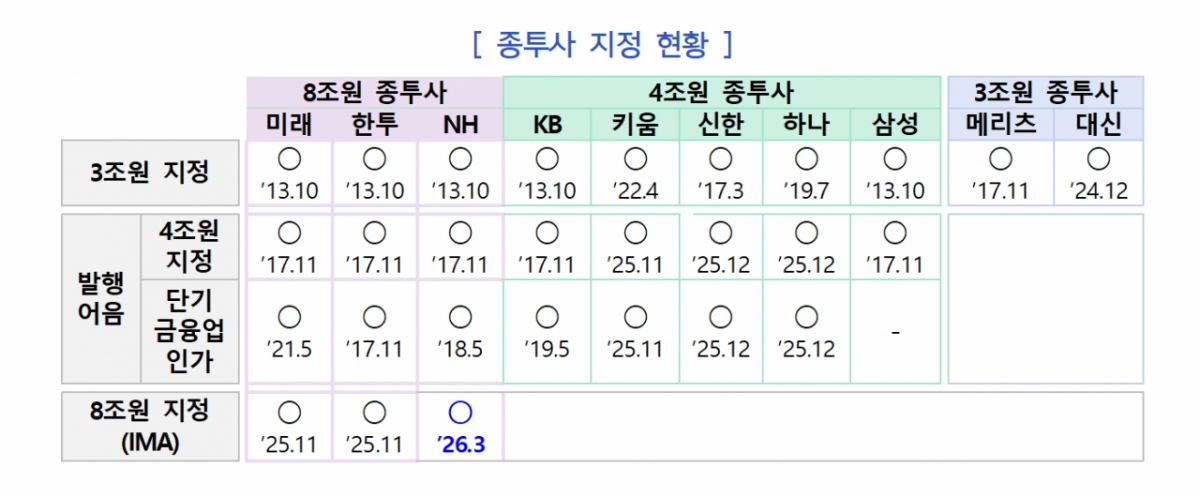 금융위 관계자는 "금번 추가 지정으로 IMA 업무 영위가 가능한 종투사는 모두 3개 사가 됐다"며 "모험자본 공급 등 기업의 다양한 자금 수요에 대응해 나갈 것으로 기대된다"고 밝혔다.