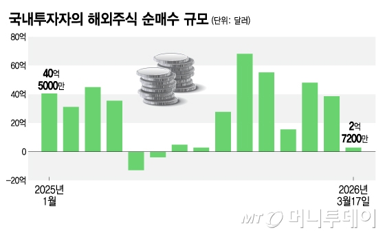 지난 1월 48억400만달러, 2월 38억5000만달러 순매수를 기록했지만 3월 들어 순매수 금액이 급격히 줄었다. 이란전 불확실성으로 글로벌 증시 변동성이 커지고 고환율 상황이 지속되면서 해외투자 수요가 감소한 것으로 보인다.
