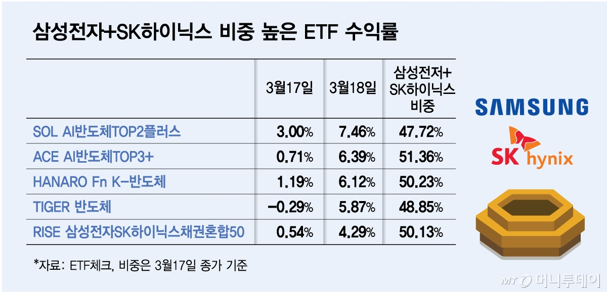 지난 17일 종가 기준 국내 상장된 ETF 상품 중 삼성전자와 SK하이닉스 비중이 가장 높은 상품은 미래에셋자산운용의 TIGER 반도체TOP10(35,170원 ▲2,070 +6.25%)과 한국투자신탁운용(한투운용)의 ACE AI반도체TOP3+(49,635원 ▲2,980 +6.39%)다. TIGER 반도체TOP10은 SK하이닉스 29.63%, 삼성전자를 24.82%로 총 54.45%를 담고있고 ACE AI반도체TOP3+는 삼성전자를 25.54%, SK하이닉스를 25.82%로 총 51.36% 담고 있다.