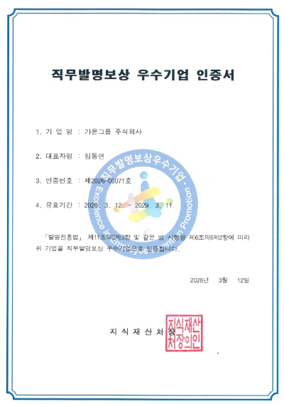 가온그룹(6,270원 ▼120 -1.88%)이 지식재산처 주관 '2026년 직무발명보상 우수기업'으로 인증 받았다고 19일 밝혔다.