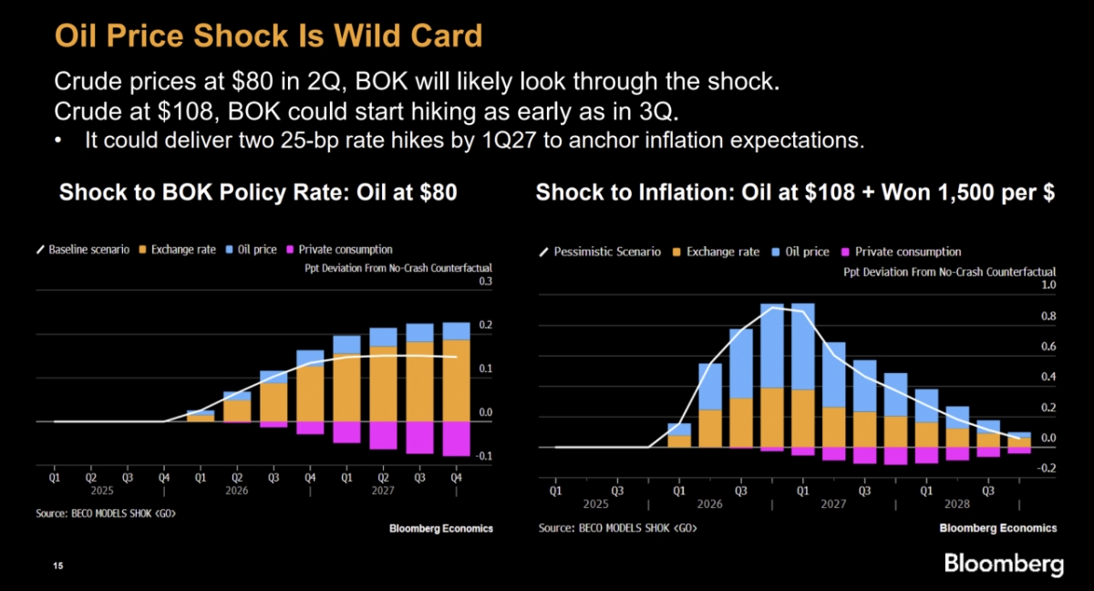발표자로 나선 권효성 블룸버그 한국·대만 이코노미스트는 중동 전쟁 시나리오 4가지를 제시하고 낮은 강도의 전쟁 가능성이 가장 높다고 바라봤다. 권 이코노미스트는 "전쟁의 강도가 현재 수준이고 호르무즈 해협 봉쇄가 완화되는 상황에서는 유가가 80달러로 안정될 것"이라며 "충격이 일시적이라 한국은행은 물가가 높아지더라도 현재 기준 금리인 2.5%에서 상승을 결정하진 않을 것"이라고 내다봤다.