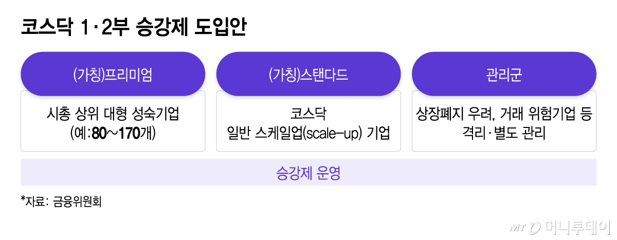 예컨대 1부는 프리미엄, 2부는 스탠다드로 나눠 요건충족 여부에 따라 시장진입·퇴출이 이뤄지는 방식이다. 프리미엄 시장에는 시가총액 상위 대형 성숙기업(80~170개사), 스탠다드에는 코스닥 일반 스케일업(외형확대) 기업으로 분류한다. 프리미엄 내 상위권 대표기업 중 중심지수를 신규 개발하고 연계 ETF를 도입해 투자기반을 확대한다는 계획이다.