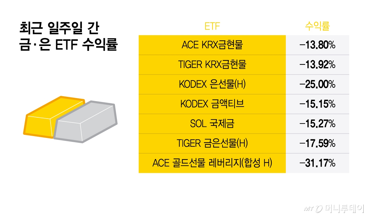 최근 일주일 간 금, 은 ETF 수익률/그래픽=윤선정