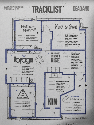 JYP는 23일 공식 채널을 통해 엑스디너리 히어로즈의 여덟 번째 미니 앨범 '데드 앤드(DEAD AND)'의 트랙리스트를 공개했다. 이번 신보에는 타이틀곡 '보이저(Voyager)'와 선공개곡 '엑스 룸(X room)'을 비롯해 '헬륨 벌룬(Helium Balloon)', '노 쿨 키즈 존(No Cool Kids Zone)', '헐트 소 굿(Hurt So Good)', '라이즈 하이 라이즈(Rise High Rise)', '케이티엠(KTM)' 등 총 7곡이 수록된다.