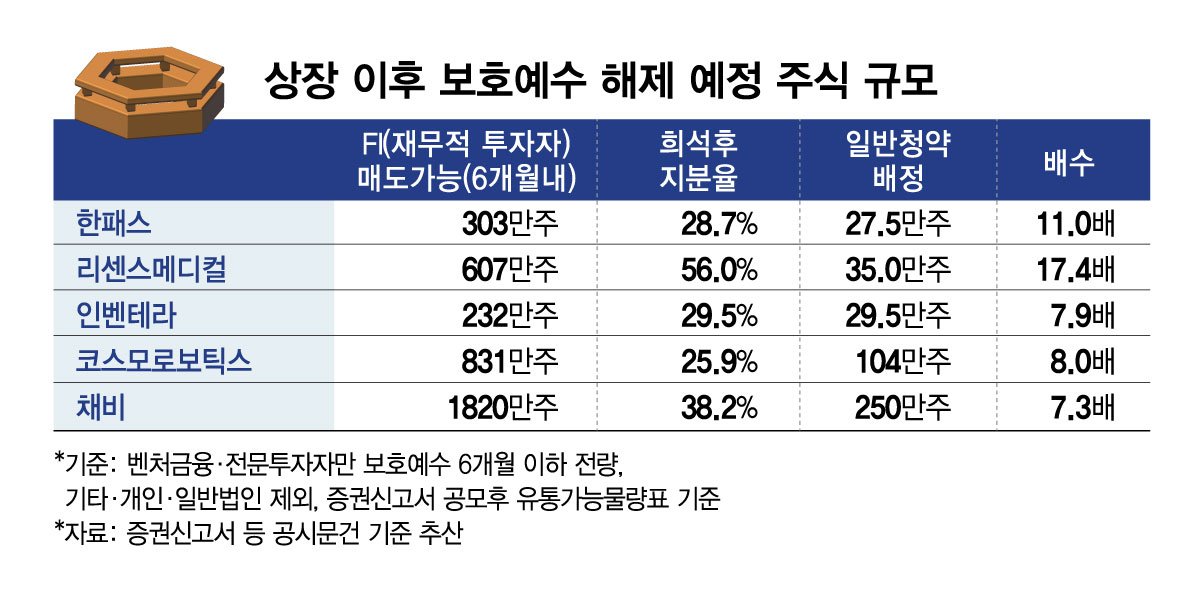 23일 머니투데이가 IPO 예정 기업들의 증권신고서를 분석한 결과 채비, 인벤테라, 코스모로보틱스, 한패스, 리센스메디컬의 상장 이후 반년 내 보호예수가 풀리는 물량(벤처금융, 전문투자자의 보유주식 기준)이 일반공모 물량의 7~17배 규모로 나타났다.