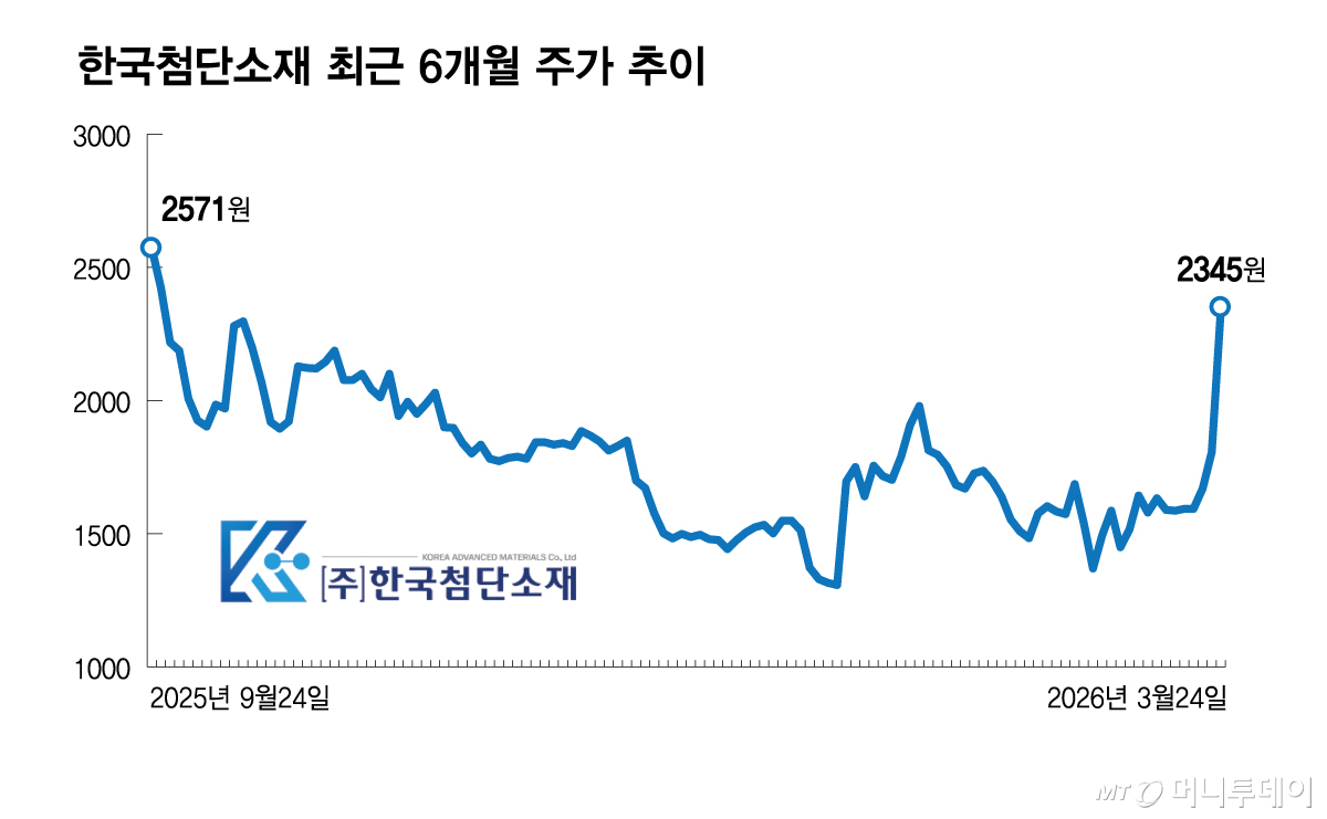 24일 한국거래소에 따르면 이날 한국첨단소재(2,345원 ▲539 +29.84%) 주가는 전장보다 539원(29.84%) 오른 2345원에 거래를 마쳤다. 한국첨단소재는 3거래일째 강세를 나타냈다.