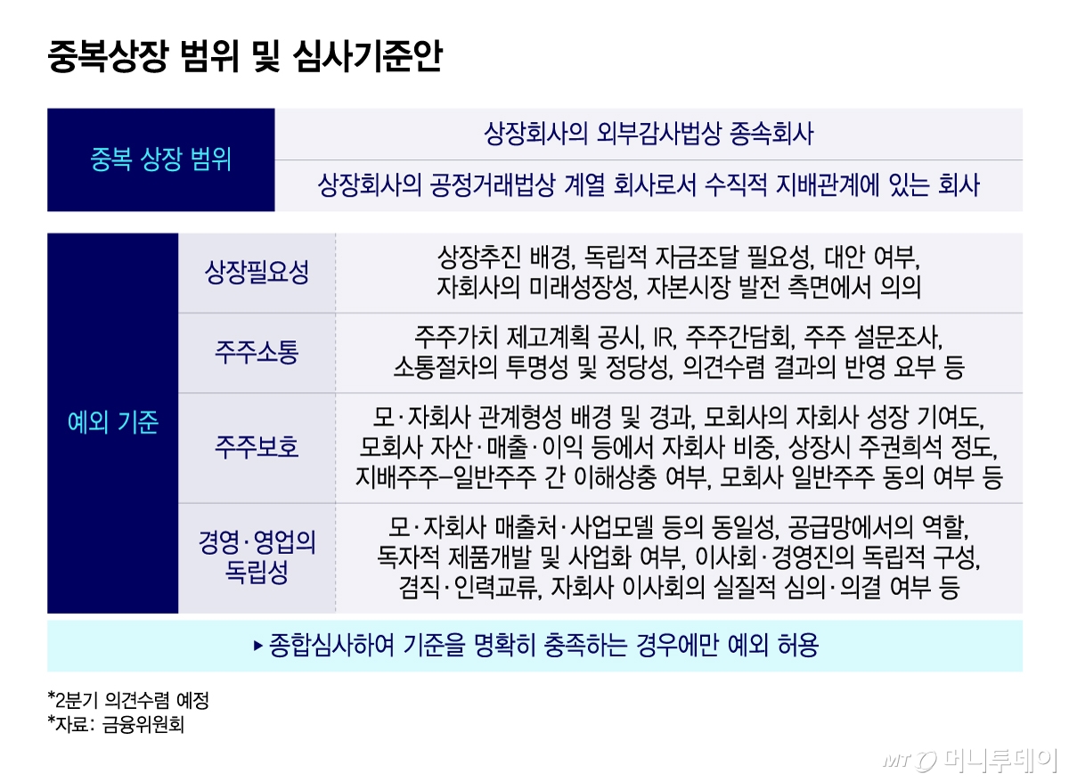 구체적으로 중복상장의 범위는 △상장회사의 외부감사법상 종속회사 △상장회사의 공정거래법상 계열회사로 수직적 지배관계에 있는 회사(손자회사 등 포함)를 상장하는 경우로 명확해질 예정이다.