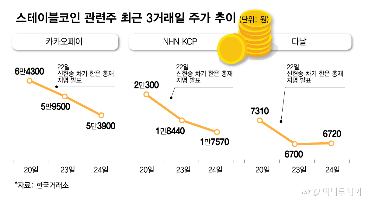 스테이블코인 관련 주는 이틀 연속 하락세다. 지난 22일 이재명 대통령이 차기 한국은행 총재로 신현송 국제결제은행(BIS) 통화경제국장을 지명한 영향 탓이다. 증권가에서는 신 후보자가 중앙은행 중심의 디지털 금융 혁신에 적극적이지만 민간 가상자산에는 보수적인 입장을 가졌다고 평가한다.