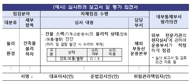 우선 실사점검 보고서를 첨부해 공시하도록 했다. 자산운용사는 외부 전문업체가 실시한 현지실사에 대해 자체적으로 점검(서면)하고 내부통제부서가 이에 대한 평가의견을 작성해야 한다. 최종적으로 대표이사와 준법감시인, 위험관리책임자 등으로부터 서명을 받아야 한다.