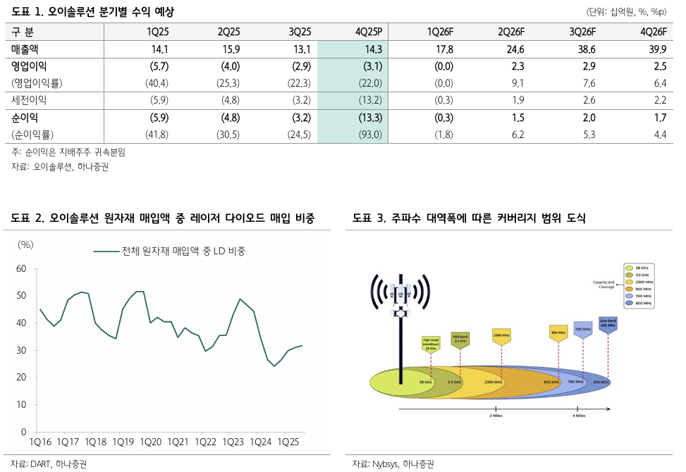 하나증권에 따르면 오이솔루션은 올해 말까지 국내외 신규 주파수 경매를 진행한다. 이에 따라 연말 전에 대규모 프론트홀향 트랜시버 수주를 확보해 흑자전환할 가능성이 있다.