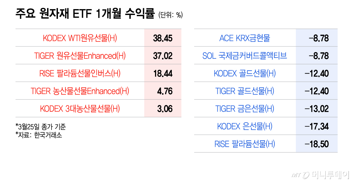 미국과 이란 전쟁 발발 이후 원자재 ETF(상장지수펀드)간 희비가 엇갈리고 있다. 원유와 농산물 ETF는 높은 수익률을 보이고 있으나 금, 은, 구리 등은 마이너스 수익률을 기록 중이다. 금융투자업계 전문가들은 당분간 이런 흐름이 이어질 것이라고 전망했다.