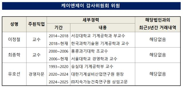 유호선 사외이사 후보는 1955년생으로 숭실대 기계공학부 교수, 대한기계설비산업연구원 원장을 역임한 이후 지난해까지 지속가능건축연구원 상임고문을 맡았던 공학 전문가다. 케이엔제이가 영위하고 있는 반도체·설비 사업 관련 기술 트렌드를 분석해 대규모 투자 결정 시 기술 리스크를 점검하는 역할을 맡았다.