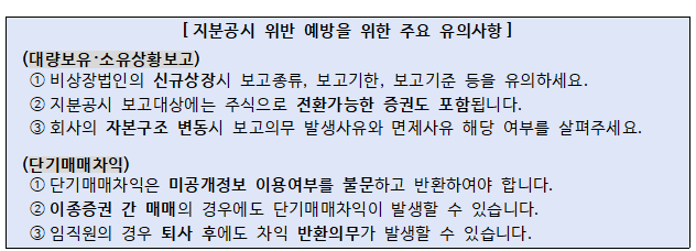 금감원은 지분공시제도 관련 법규에 대한 이해 부족, 보고의무자의 낮은 인식 등으로 단순한 공시 위반과 단기매매차익 제도 위반이 반복적으로 발생하고 있다며 주요 위반사례와 유의사항을 안내한다고 30일 밝혔다.