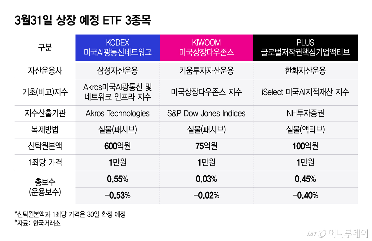 오는 31일 미국 기업에 투자하는 ETF(상장지수펀드) 3종목이 동시 상장된다. 신탁원본액, 총보수, 복제방법 등 투자 포인트가 각기 달라 어떤 ETF가 인기를 얻을지 주목된다.