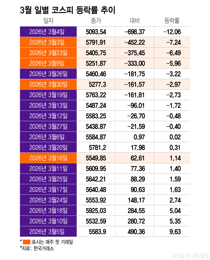 한국거래소에 따르면 코스피지수는 3월 들어 단 하루를 제외하고 매주 첫 거래일에 하락 마감했다. 5주 중 4주를 하락장으로 출발한 셈이다. 낙폭이 가장 컸던 날은 7.24% 하락한 지난 3일 화요일이었다. 다음으로 낙폭이 큰 날은 6.49% 떨어진 지난 23일, 5.96% 내린 지난 9일 순이다. 이날도 코스피지수는 전거래일 대비 2.97% 하락한 5277.30으로 마감했다.