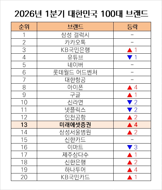 미래에셋증권이 '2026년 대한민국 100대 브랜드'에서 종합 13위를 기록하며 지난해보다 4계단 상승했다.