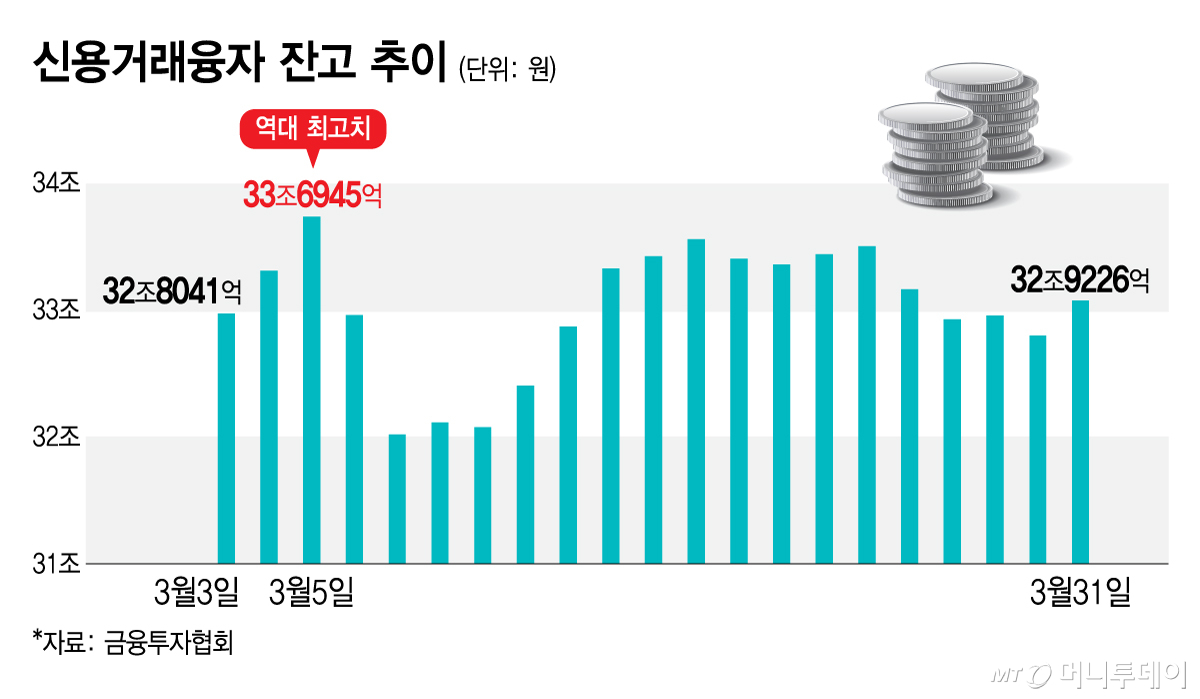 1일 금융투자협회에 따르면 지난달 31일 신용거래융자 규모는 코스피와 코스닥을 합해 32조9226억원으로 집계됐다. 지난달 5일 33조6934억원으로 역대 최고치를 기록한 이후 지난달 26일부터 32조원대로 주춤하다 다시 증가폭을 키우는 모양새다.