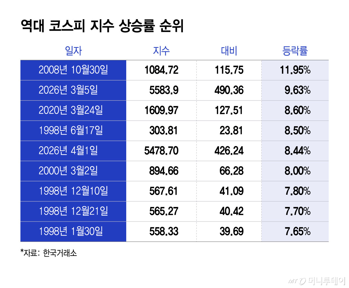 두번째로 높았던 날은 9.63% 오른 지난 3월5일이다. 미-이란 전쟁 발발 영향으로 코스피가 3월3일, 4일 이틀 연속 각각 7.24%, 12.06% 하락했는데, 이날 트럼프 대통령의 발언으로 조기 종전 기대감이 반영된 결과다. 이날 코스피는 일일 상승폭 기준으로 역대 최대치를 기록했다.