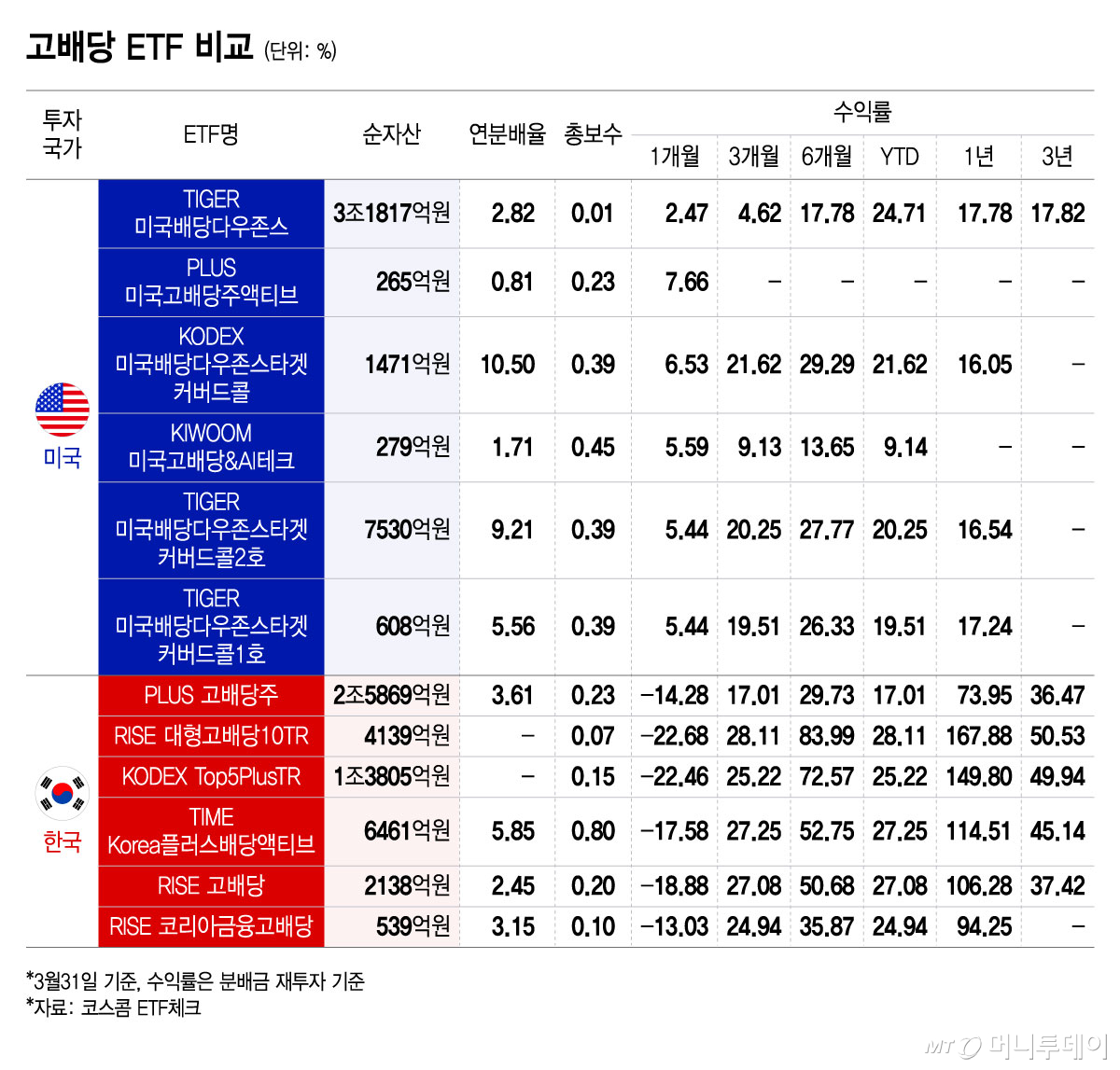 미국과 이란 전쟁 발발 이후 변동성 장세가 장기화하면서 고배당 ETF(상장지수펀드)에 관심이 높아지고 있다. 국내 상장된 고배당 ETF 중 미국에 투자하는 상품은 전쟁 발발 이후에도 수익을 냈지만, 국내 고배당 ETF들은 마이너스 수익률을 기록했다. 반면 장기 수익률은 국내 고배당 ETF가 더 높았다.