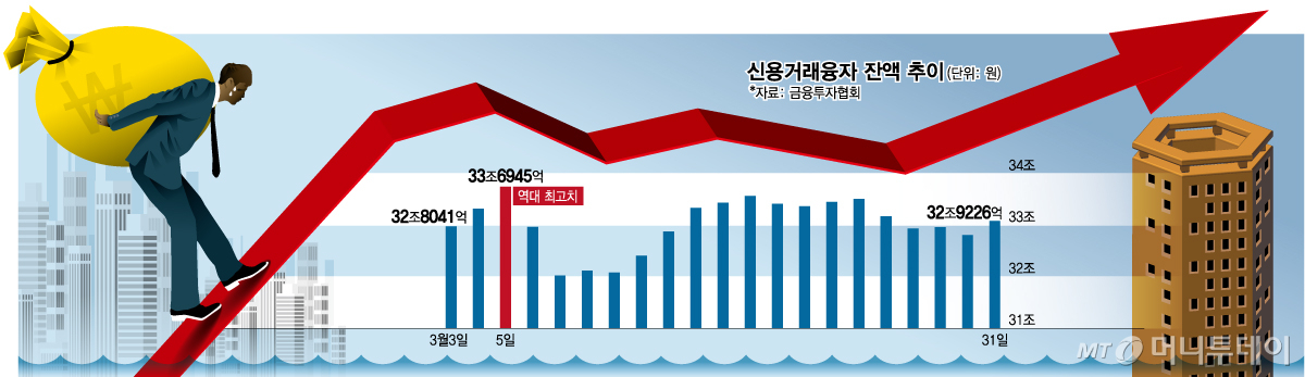 1일 금융투자협회에 따르면 지난달 31일 신용거래융자 규모는 코스피와 코스닥을 합해 32조9226억원으로 집계됐다. 지난달 5일 33조6934억원으로 역대 최고치를 기록한 이후 지난달 26일부터 32조원대로 주춤하다 다시 증가폭을 키우는 모양새다.