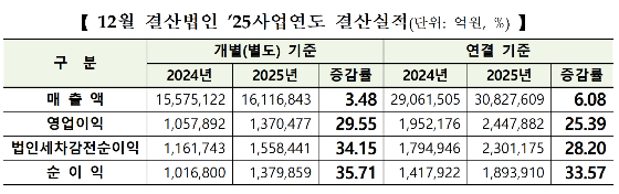 그러나 연결기준으로는 두 회사를 제외하고도 매출액, 영업이익, 순이익이 모두 4.45%, 10.76%, 15.64%씩 증가했다.