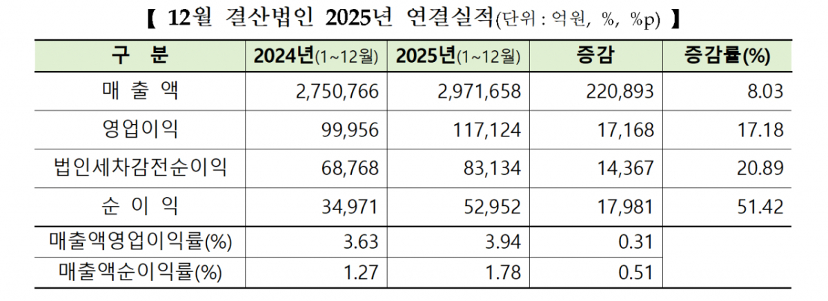 2일 한국거래소가 발표한 '코스닥시장 12월 결산법인 2025사업연도 결산실적'에 따르면 코스닥 시장에 상장된 12월 결산법인 1268곳의 지난해 연결기준 영업이익은 전년 대비 17.18% 증가한 11조7124억원이었다. 순이익은 51.42% 증가한 5조2952억원을 기록했다. 매출은 297조1658억원으로 2024년보다 8.03% 늘었다. 매출액 대비 영업이익률은 3.94%로 전년 대비 0.31%p(포인트) 늘었다.