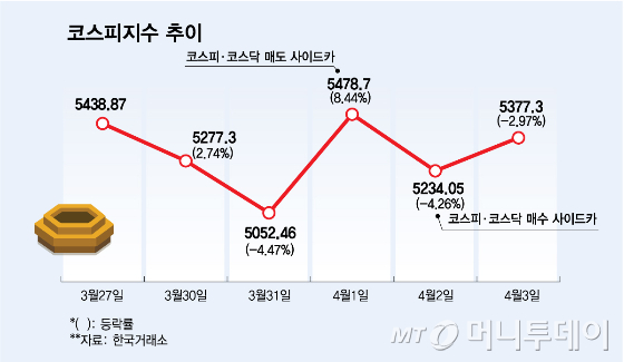 5일 한국거래소에 따르면 지난주(3월30일~4월3일) 코스피는 전주 말(5277.3) 대비 61.57포인트(1.13%) 하락한 5377.30에 거래를 마쳤다. 이 기간 코스피 시장에서 외국인이 42조9308억원을 순매도했다. 개인과 기관은 각각 35조1702억원, 2조8339억원을 순매수했다.
