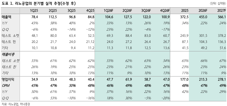 올해 1분기 매출은 전년동기대비 33% 증가한 1046억원, 영업이익은 37% 늘어난 477억원 등을 기록할 것으로 전망했다. 하나증권은 리노공업이 주요 고객사의 모바일 신모델 판매량 호조와 자체 칩 개발 기조가 전사 실적을 견인하고 있다고 파악했다.