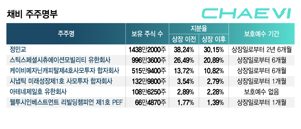 채비는 PEF(사모펀드)로부터 대량의 출자를 받은 결과 출자자 지분율이 최대주주인 정 대표(상장 전 38.24%·상장후 30.15% 추산)를 웃돈 상태다. 앞서 PEF 운용사인 스틱인베스트먼트는 2021년 7월(시리즈B, 주당 1만381원)과 2023년 5월(시리즈C, 주당 1만1761원)에 걸쳐 총 약 1100억원을, KB자산운용이 운용하는 KB메자닌캐피탈제4호사모투자합자회사는 2023년 6월(시리즈C, 주당 1만1761원)에 약 607억원을 각각 투자했다. 스틱과 KB 측 펀드 지분율만 해도 상장 전 기준 각각 26.49%, 13.72%에 해당한다. 시냅틱 미래성장제1호 사모투자 합자회사, 아테네제일호 유한회사, 웰투시인베스트먼트 리빌딩챔피언 제1호 PEF까지 합산하면 사모펀드 지분율이 48.4%(상장 후 38.17%)에 달한다. 일반 공모 배정물량이 250만~300만주인 것을 감안하면 사모펀드 출자분(1820만주)은 6.1~7.3배다.