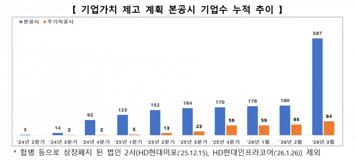 이로써 기업가치 제고 계획을 본공시한 누적 기업은 지난 2월 180개에서 지난 3월 587개로 크게 늘었다. 기존 공시 기업 중 합병 등으로 상장폐지된 HD현대미포, HD현대인프라코어 등이 2개 기업이 제외됐다.