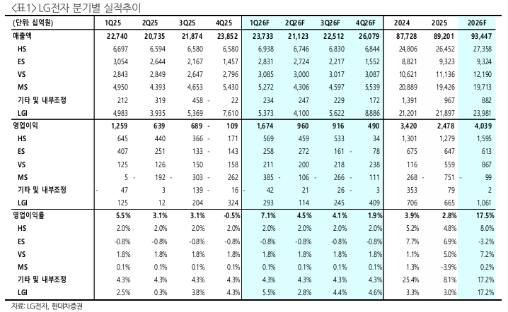 현대차증권에 따르면 LG전자의 1분기 잠정 연결 매출액은 전년동기대비 4.4% 증가한 23조7330억원, 영업이익은 32.9% 늘어난 1조6736억원을 기록했다. 이는 현대차증권의 실적 추정치를 웃돈 수준이다.
