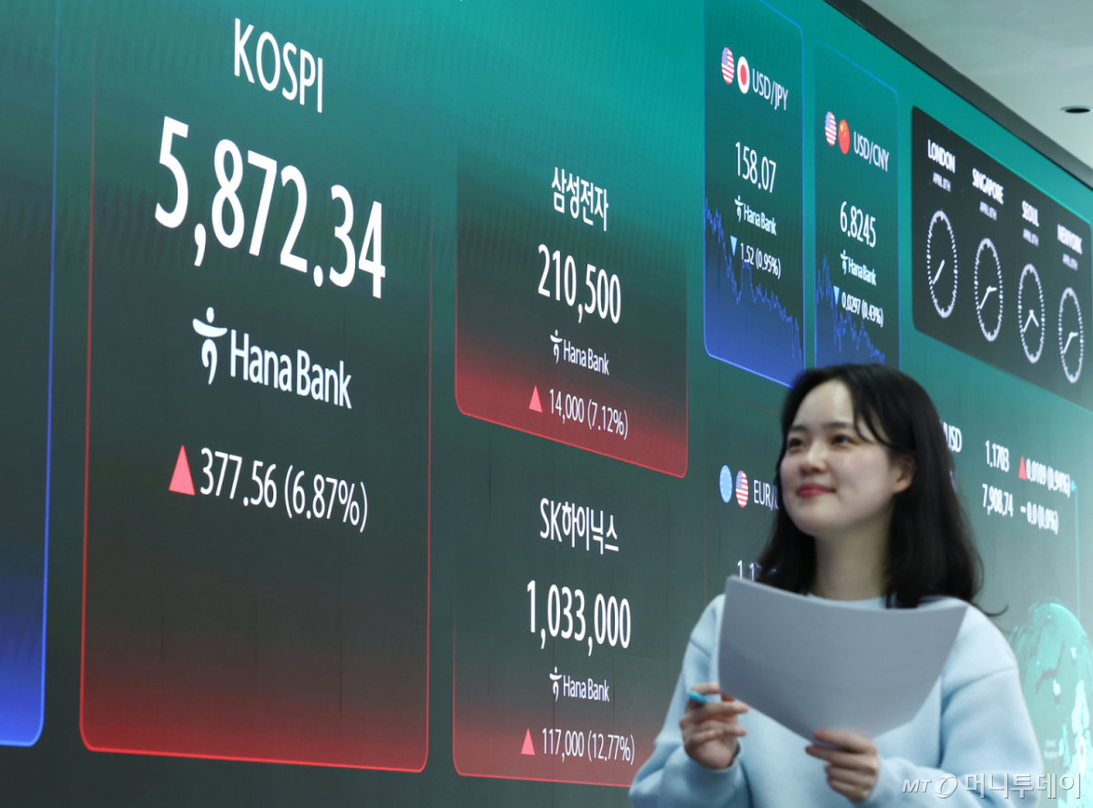 8일 한국거래소에 따르면 코스피 지수는 전일대비 377.56포인트(6.87%) 오른 5872.34로 마감했다. 이날 코스피는 309.92포인트(5.64%) 오른 5804.70으로 출발한 후 등락을 반복하며 등폭을 키웠다.