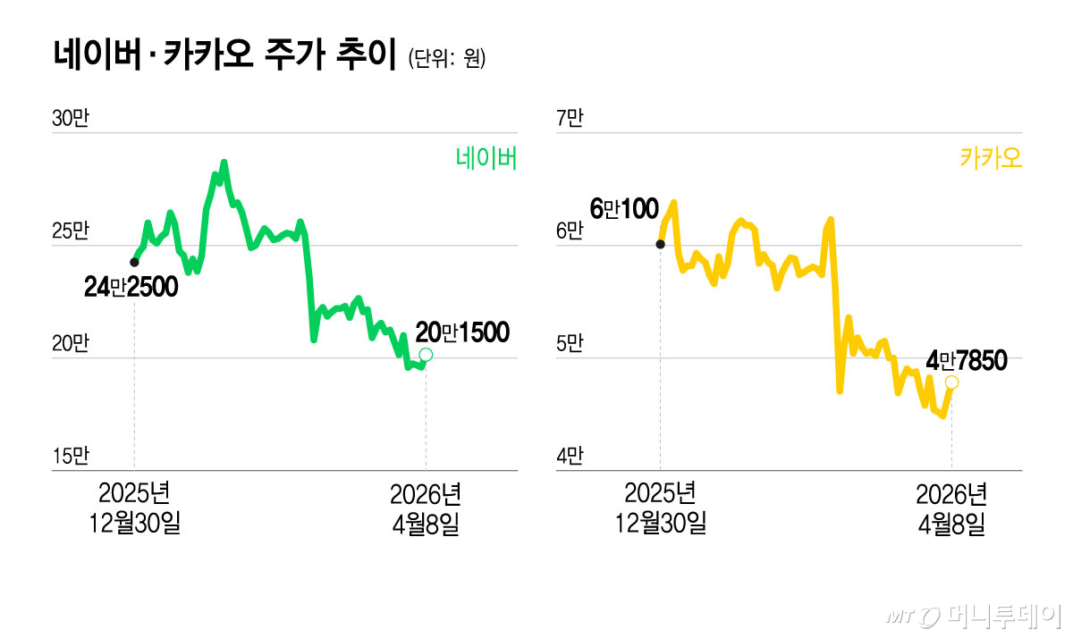 네이버(NAVER)·카카오가 올해 1분기 잠정실적 발표를 앞두고 목표주가 하향행렬을 마주했다. 주가가 코스피지수 등락과 괴리되는 현상이 해를 넘겨 장기화하면서 우려를 사는 모양새다.