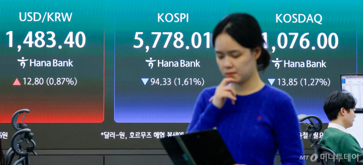 9일 코스피는 전 거래일 대비 94.33포인트(1.61%) 내린 5778.01에 거래를 마쳤다. 이날 45.89포인트(0.78%) 내린 5826.45로 출발한 코스피는 장 내내 1%대 약세를 유지했다.