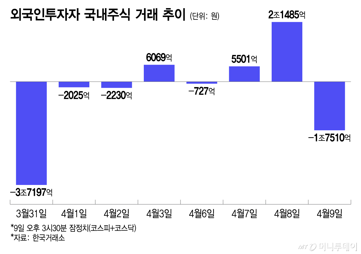9일 오후 3시30분 기준(잠정치) 외국인투자자는 코스피 시장에서 1조2596억원, 코스닥 시장에서 4914억원 규모를 순매도(매수보다 매도가 많은 것)하는 등 국내 주식을 1조7510억원어치 팔아치웠다. 외국인은 전날 2조원 넘게 순매수했으나 하루 만에 순매도로 돌아섰다.