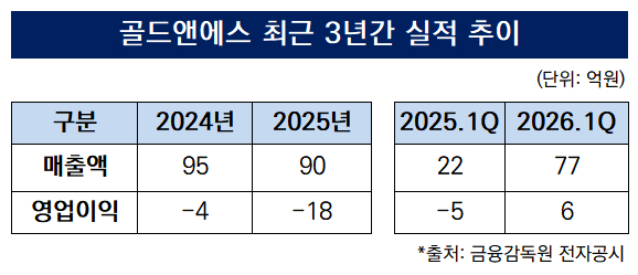 골드앤에스의 지난 1분기 잠정 매출액은 77억원 수준으로 집계됐다. 전년(22억원) 대비 250.6% 성장한 수치다. 영업이익은 -5억원에서 6억원 수준으로 늘어 흑자전환에 성공했다.