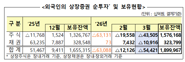 16일 금융감독원이 발표한 '2026년 3월 외국인 증권투자 동향'에 따르면 지난달 외국인투자자는 국내 상장주식 43조5050억원어치를 순매도(매수보다 매도가 많은 것)했다. 코스피에서 43조8880억원어치를 팔고 코스닥에서 3840억원어치를 사들였다.
