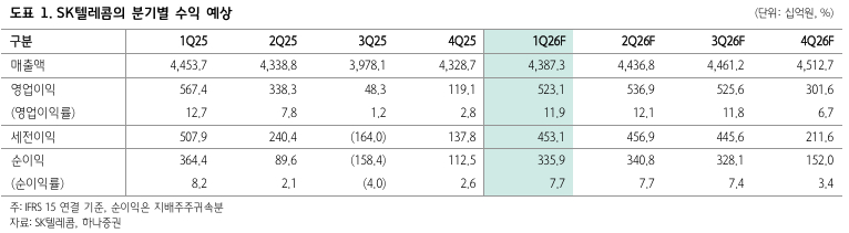 하나증권은 SK텔레콤을 국내 통신서비스 업종 내 톱픽(Top Pick)으로 제시했다. 하나증권에 따르면 올해 말 5G SA 상용화가 이뤄질 것이라고 가정해 SKT 배당수익률 밴드가 2.6%까지 하향 조정될 가능성이 높다. 내년 이후 주당배당금(DPS) 상승을 바탕으로 추가적인 주가 상승 시도가 있을 수 있다.
