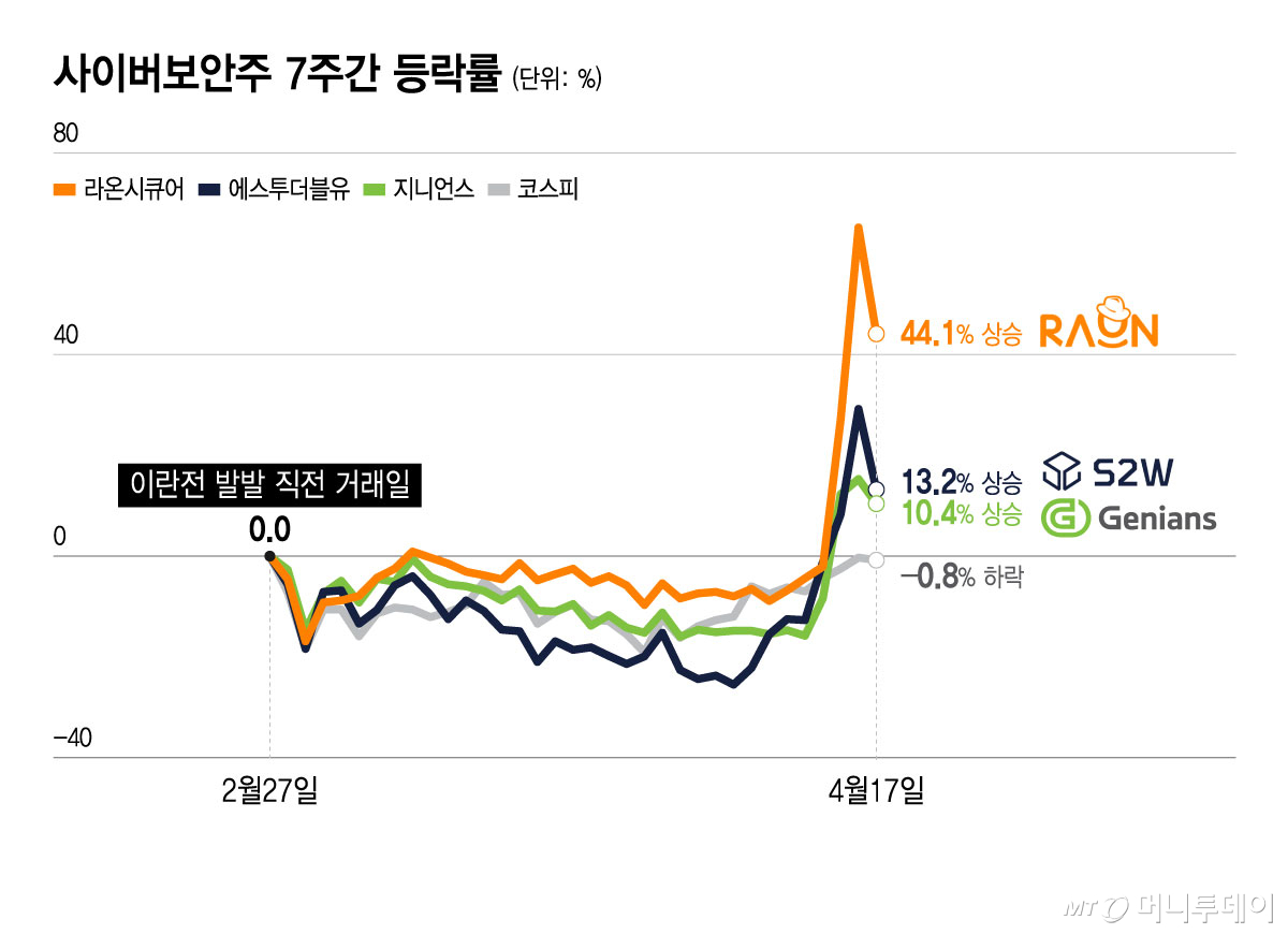 19일 한국거래소(KRX)에 따르면 지난 17일 라온시큐어(13,440원 ▼1,970 -12.78%)는 전주 대비 54.5% 오른 1만3440원, 지니언스(16,820원 ▼750 -4.27%)는 29.4% 오른 1만6820원에 장을 마쳤다. 지난해 4월 SK텔레콤 사태 이래 최대 변동폭이다. 이후 상장한 S2W(에스투더블유(20,800원 ▼2,950 -12.42%)) 역시 29.3% 올라 2만800원에 거래를 마감했다.