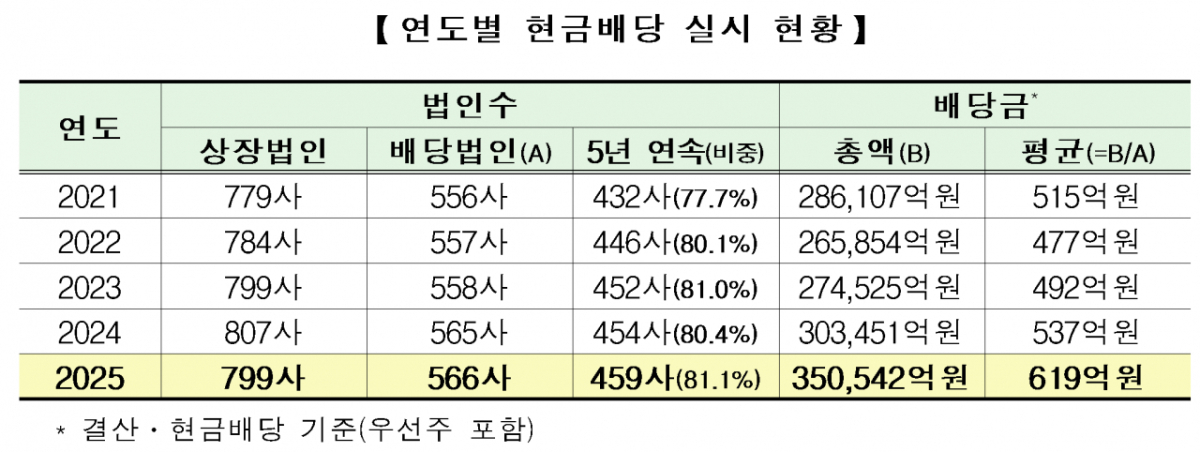 지난해 코스피 상장사에서 현금배당을 실시한 법인 중 5년 이상 연속으로 배당한 법인은 459개사로 전체 배당실시 법인의 약 81.1%를 차지했다. 코스닥 시장에서는 총 432개 기업이 5년 연속 배당을 실시했다.