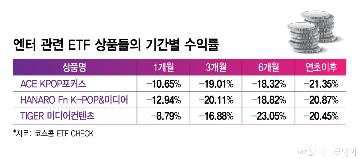 이에 엔터 4사를 포함한 지수를 기초자산으로 하는 엔터 ETF 상품의 수익률도 마이너스를 기록 중이다. 코스콤 ETF CHECK에 따르면 연초 이후 ACE KPOP포커스(9,650원 ▼220 -2.23%)의 수익률은 -21.35%다. HANARO Fn K-POP&미디어(7,130원 ▼170 -2.33%)는 -20.87%, TIGER 미디어컨텐츠(4,825원 ▼80 -1.63%)는 -20.45% 등을 기록, 구성 종목에 엔터 비율이 높은 ETF들은 나란히 마이너스 수익률을 나타냈다.