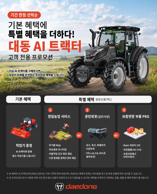 대동은 프로모션을 통해 AI트랙터 구매 고객에게 기본 혜택과 특별 혜택을 제공한다. 기본 혜택으로 로터리 등 작업기를 증정하며 △정밀농업 서비스 △운반로봇 △보증연장 부품 패키지 중 하나의 특별 혜택을 제공한다.